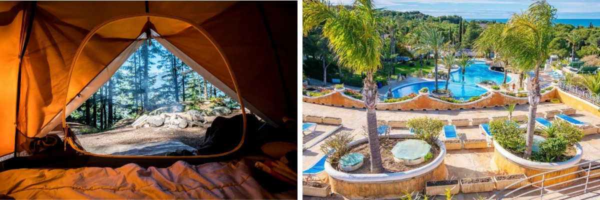 Accommodation options include outdoor tents, RVs, and luxury countryside lodges with kitchens, bathrooms, living areas, and bedrooms.